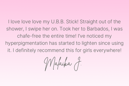 No Need To Buy Multiple Products, just swipe the U.B.B. Stick! daily on ALL areas of clean dry skin. Under breasts, belly and bra straps! B’twixt your thighs, skin folds and love handles! B’tween the creases of your back and even behind your knees! (Re-apply as needed)